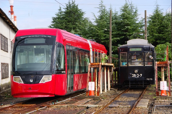 MLRV1002(左)とデ7075(コカ・コーラ広告車)。車体全面広告車が拡充したなか、これまでの動向から稼働を取り止めているとみられるMLRV1002が、唯一アイトラム標準色を見られる機会であるのは、複雑な心境だ。
