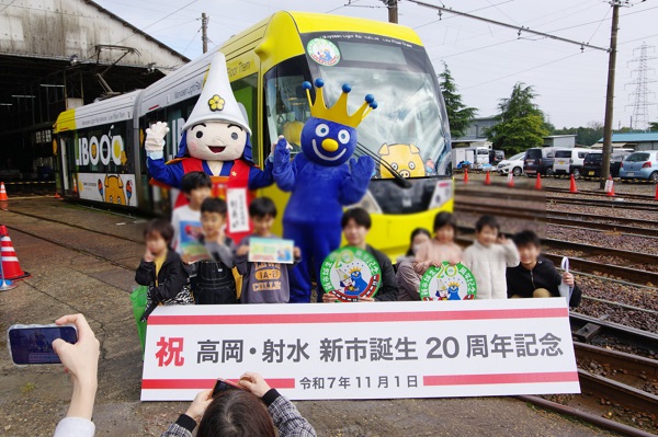 高岡市・射水市の新市誕生から20周年を記念したヘッドマークやステッカーのお披露目式。高岡市のキャラクター「利長くん」と射水市のキャラクター「ムズムズくん」も参列した。