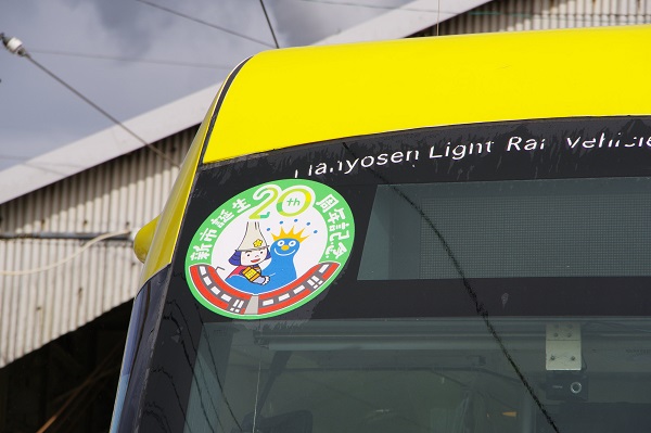 新市誕生20周年記念ヘッドマーク。ハグしている「利長くん」と「ムズムズくん」の下には、オリジナルカラーのアイトラム。