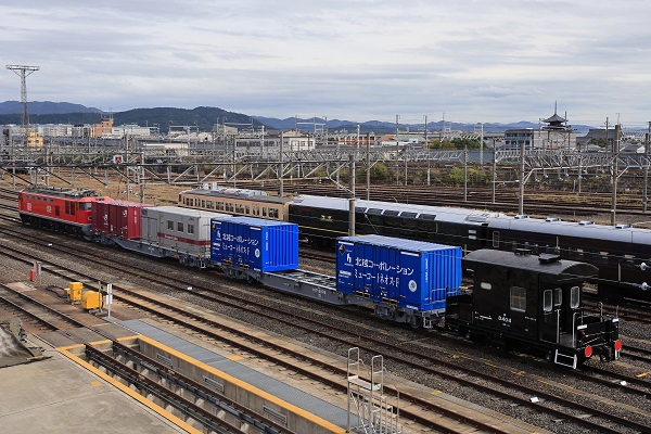 コンテナは、19D-60001、ResearchCabin ZX45A-2、北越コーポレーショU32A-5065、U32A-5031が、京都貨物駅で搭載された。