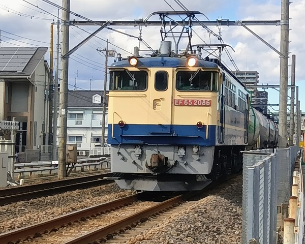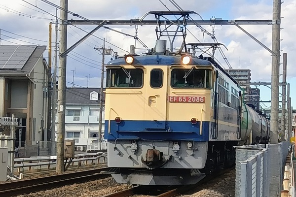 奈良仁一郎臨時8764列車を代走で牽引したEF65 2086。‘25.11.10 高崎線 北上尾~上尾 2025年11月10日、高崎機関区EH200の仕業である臨時8764列車は、高崎操車場~新鶴見信号場間で、新鶴見機関区所属のEF65 2086が代走で担当し注目となった。なお、編成はタキ5両だった。■関連記事◆高崎線3091列車、8764列車をEF65 2085が代走P:藤倉顕治