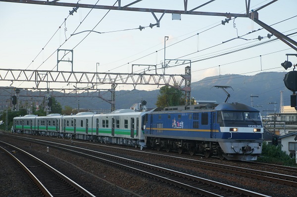夕暮れの琵琶湖線を行く甲種輸送列車。吹田(タ)からはEF210-345が牽引した。