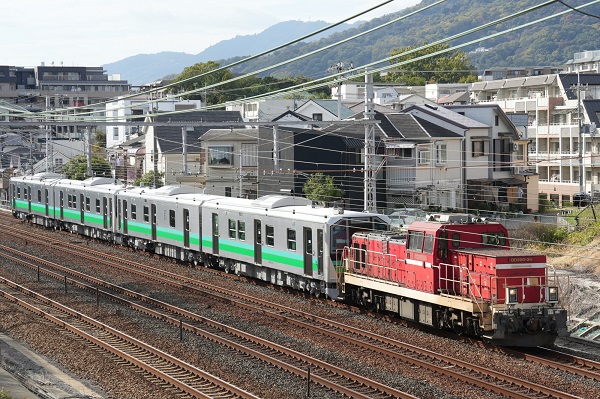 川車~吹田(タ)間はDD200-24が牽引、阪神間を行く甲種輸送列車。