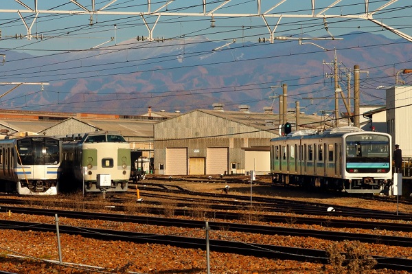 出区した211系N301編成(左)による長野駅往復の訓練運転。昼前後に出区する定期運用はなく、背後の幕張、新前橋(高崎)での「同僚」との顔合わせを意識して狙ってみた。