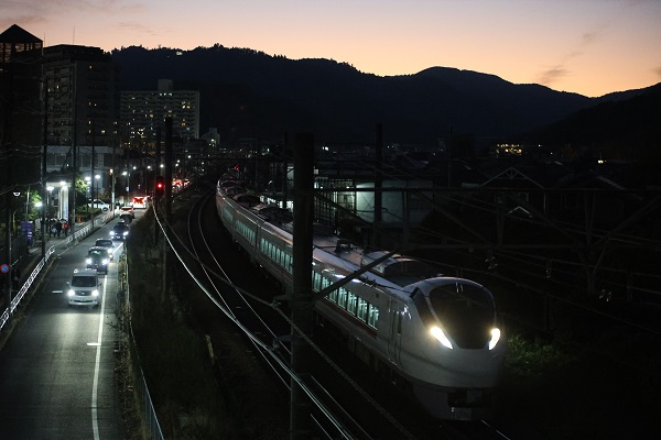 夕暮れの高尾山をバックに高尾を出発し、次の停車駅常磐線柏を目指す特急「常磐高尾」のE657系。