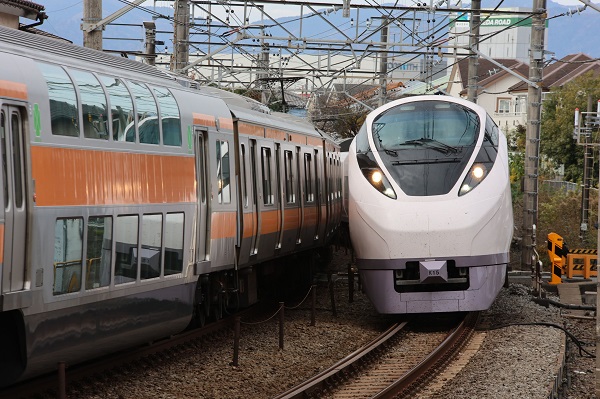 往路の高尾→豊田への回送シーン。中央線快速電車E233系グリーン車ともすれ違うシーンが見られた。