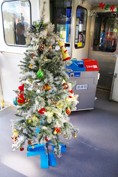 車内にクリスマスの装飾を施した「クリスマス列車」。