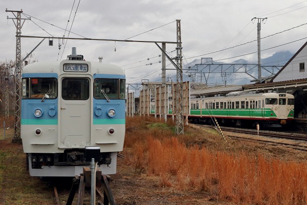 ◆新信州色となったしなの鉄道115系S11編成、屋代で「試運転」表示で待機