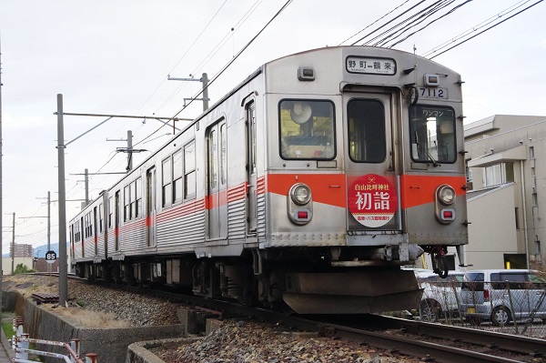 「白山比咩神社初詣電車バス」PRヘッドマークを掲出したモハ7101+クハ7111編成。