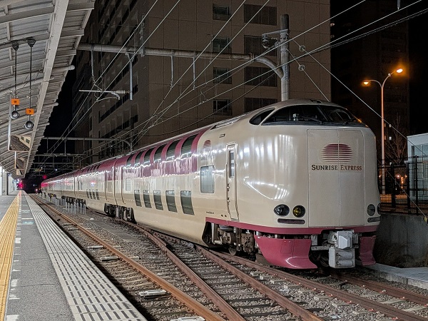 植松 繁定期便は14両編成がホーム一杯に停車する大阪駅も、ホーム中ほどで停車。‘25.12.29 東海道本線 大阪 2025年12月29日、臨時寝台特急「サンライズ出雲92号」が出雲市発東京行きで運転された。定期列車で行う岡山駅での「サンライズ瀬戸」との併結は行わず、285系7両編成だった。■関連記事◆「サンライズエクスプレス」が高松でアサネ中…?P:植松 繁