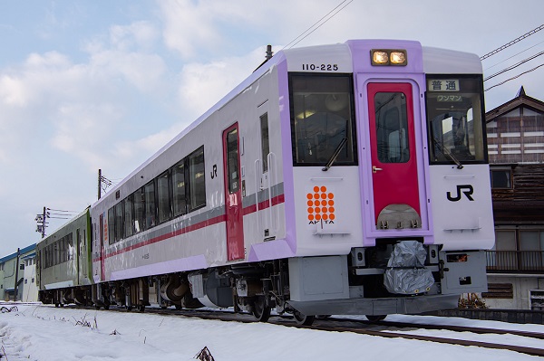 2025年12月29日より、長野総合車両センターに所属しているキハ110-225が、「秋田リレー号」塗装に変更されてから、初めて飯山線の定期列車に投入された。