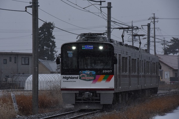 尾名高大蔵20107編成に「年末年始 輸送安全総点検」のヘッドマークを掲出。‘26.1.2 アルピコ交通 大庭~信濃荒井(3点共) 2026年1月2日、アルピコ交通では、20100形20107編成に「年末年始 輸送安全総点検」のヘッドマークを掲出していた。■関連記事◆アルピコ交通20100形が「謹賀新年」のHMを掲出P:尾名高大蔵