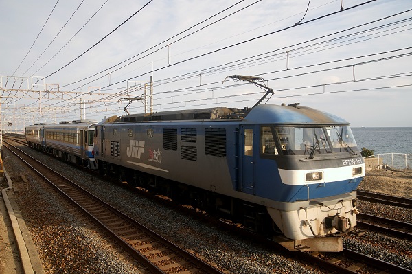 石田哲彦須磨海岸をEF210-157号機牽引で九州へ向かうキハ185系。‘26.1.15 山陽本線 須磨~塩屋 2026年1月15日、JR四国キハ185系2両のJR九州への譲渡にともなう甲種輸送の2日目は、鷹取(神戸貨物ターミナル)で折り返し、山陽本線を西小倉へ向かった。 牽引機は、吹田機関区所属のEF210-157で、四国から引き続き機回しのうえ、山陽区間の牽引を務めた。■関連記事◆JR四国キハ185系2両を甲種輸送で九州へP:植松 繁