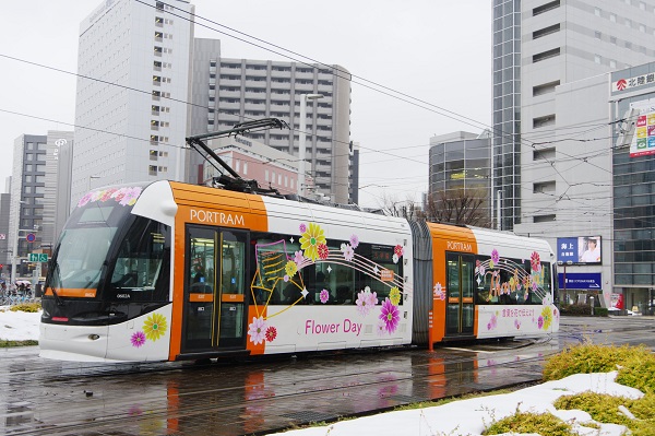 富山地方鉄道では、市内電車各線および富山港線で運行している0602号車両(オレンジ色)の外装に、「花贈りの日」をPRするラッピングを施し、2026年2月6日より運行を始めた。