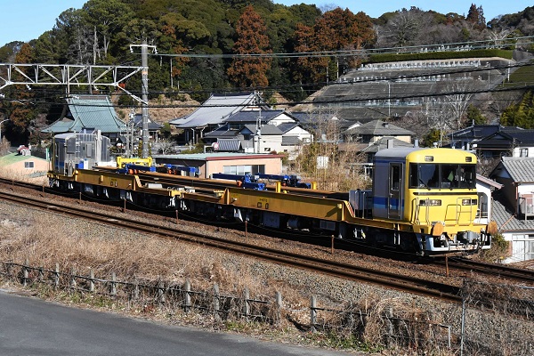 2026年2月9日、名古屋車両区所属・レール積卸用クレーン装備の定尺レール運搬用キヤ97系R3編成が、25mレール38本を積載した静岡地区への工事列車として東海道本線を東上した。