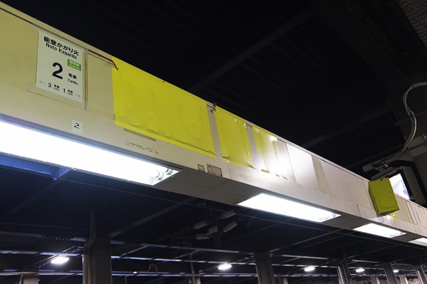 そんな中、梁の表面を綺麗にする工事が現在進められていて、合わせて特急「能登かがり火」の乗車口案内を変更した模様。