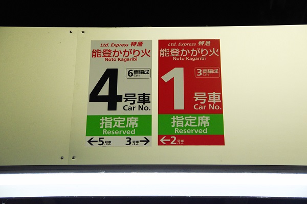 ホーム頭上に掲示されている特急「能登かがり火」の乗車口案内、新たなデザインに変更した。
