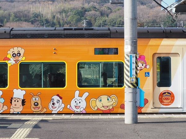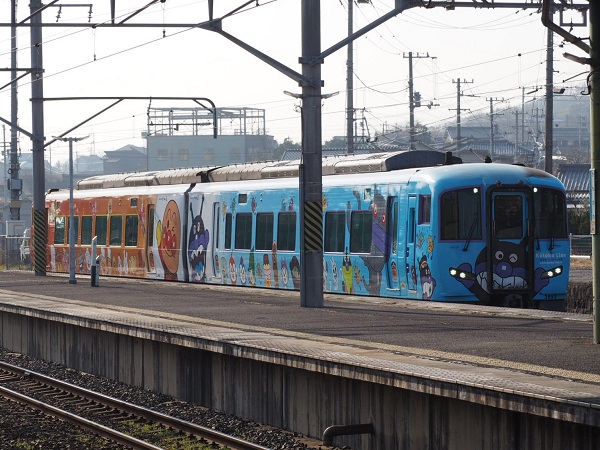鴨川駅で定期列車を待避する「高徳線アンパンマン列車」。
