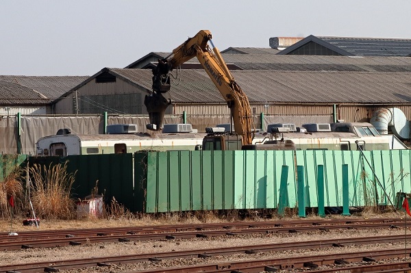 最終運用から6年10ヶ月余りを経て、115系6連通過直後の9時15分、通風機の撤去からクハ189-9の解体が開始された。