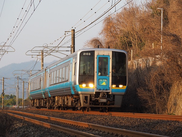 植松 繁朝陽を浴びて高松を目指す「いしづち4号」。‘26.2.21 予讃線 端岡~鬼無 2026年2月21日、多客期恒例の予讃線特急「しおかぜ」が全編成岡山行きとなるのにともない、宇多津発のシャトル特急「いしづち4号」は高知運転所所属の2000系特急型気動車2両編成(2103-2155)で運転された。■関連記事◆【JR四国11月3連休多客期輸送】シャトル特急「いしづち22号」を8000系5両編成で運転P:植松 繁
