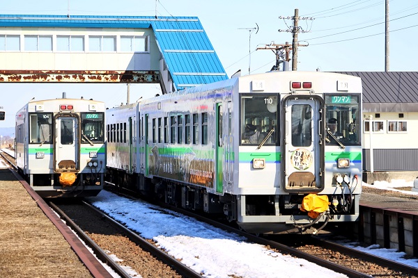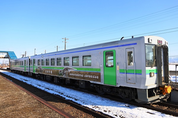 佐藤直幸むかわ竜ラッピングのキハ150 110。‘26.2.25 室蘭本線 古山(3点共) 2026年2月25日、むかわ竜ラッピングのキハ150 110が再び運用に就くのを確認した。苫小牧運転所には10両のキハ150があり、むかわ竜はそのうちの1両だが、意外と運用の機会は少なく、そう頻繁には見られない。■関連記事◆久しぶりにキハ150形「むかわ竜」が室蘭本線の運用に就くP:佐藤直幸