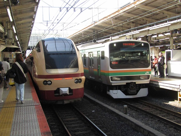 横浜駅に到着した臨時特急「常磐熱海号」が、隣に入線した宇都宮行きの上野東京ライン宇都宮線直通E231系1000番代コツS-12編成と顔を合わせた。