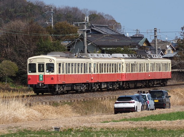香川マラソン多客輸送が実施されていた2025年3月15日、休日ながら4両編成に増結されていた列車を記録していたら、定期列車が走らない時間に踏切が鳴り始めたので、驚いてカメラを構えるとファインダーに見えたのはファンタンゴレッドをまとった1070形と1080形の4両編成だ。しかも、定期運用時とは異なり2扉1070形1071号が琴平方先頭に立っているではないか。慌ててシャッターを押し、貴重な記録を残すことができた。
