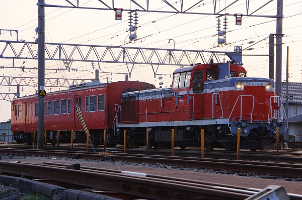 夕刻の金沢市内を走行するDE10 1116+キハ47 1013の配給輸送列車。いつ実施されるかわからない中、DE15形返却目的で沿線で待っていた最中に現れた。