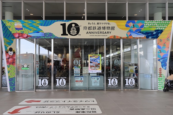 京都鉄道博物館は、2026年4月29日で開館10周年を迎えることを記念して、館内が飾り付けであふれている。本館1階の1800形1801号機は記念ヘッドマーク掲出の他、現役最後の東洋レーヨン専用線での引退セレモニーの様子をイメージした装飾がほどこされている。