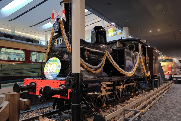 プロムナードのC62 26にも記念ヘッドマーク掲出、鉄道をモチーフにした10種類の絵柄が入り口や館内柱、スチーム号乗場への通路等を彩り館内はお祝いムードいっぱいだ。