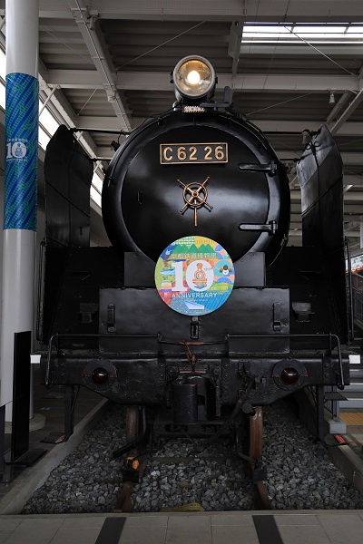 プロムナードのC62 26号機が記念ヘッドマークで迎えてくれる。