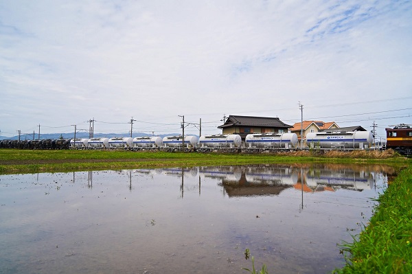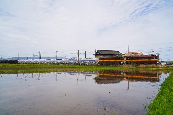 水田リフレクション、田園地帯を駆け抜け、富田駅に向かうセメント貨物(新型タキ1300×(8)B+既存タキ1900×(8)B)。