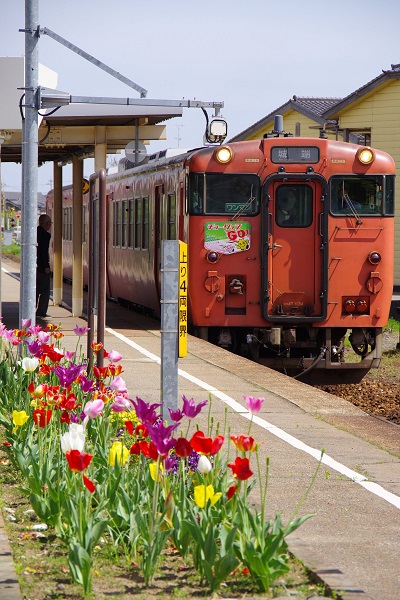 城端線では、開幕初日にあわせ、普通列車333Dと336Dの高岡~城端間1往復に、「チューリップ号」のヘッドマークを掲出した。