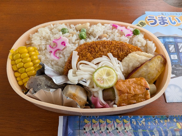 「藍よしのがわトロッコ」特製の「徳島うまいんじょ弁当」が、今シーズンから新発売となっている。「うまいんじょ」とは徳島の方言で「美味しい」という意味。徳島県民のソウルフードとも言える鳴門の鯛めし、小松島のフィッシュカツ、そして、半田そうめんなど徳島の食材と郷土の味を満載したトロッコ列車限定のお弁当を一度はご賞味あれ。