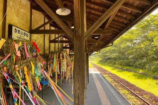 植松 繁今年もジャンボ七夕飾りが宇和島駅に出現。'25.7.26 予讃線 宇和島 宇和島駅近くの保育園児たちが書いた願い事が、改札前コンコースに設置された長さ約8メールのジャンボ七…