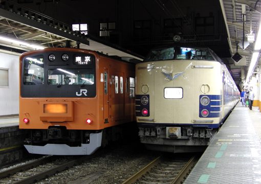 田中 友(東京都)中央線開業120周年の記念行事にふさわしい201系と583系の並び。'09.10.9 中央本線 八王子 P:田中 友高架化工事の現場をバックに。このシーンも中央線…