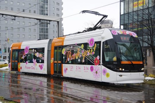 宮島昌之恒例の「花贈りの日」PRのラッピング装飾。今年はポートラムの0602号(オレンジ色)の外装に施した。ラッピングのデザインは、細かく見ると車体左右で異なる。手紙や花の色および…