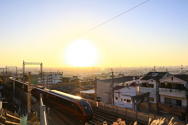元旦日の入り前、「ひのとり」が車体をキラリと輝かせ大阪平野を駆け下りる。