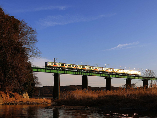 穏やかな冬晴れの下、夕陽に車体を輝かせて入間川を渡るE231系3000番代。