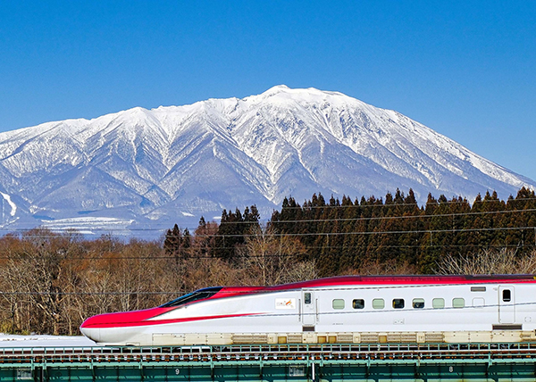 雪化粧の岩手山と赤い「こまち」がクッキリと碧空にとけ込みました。