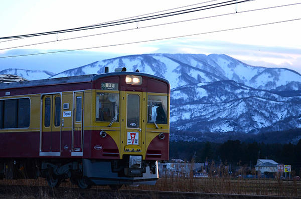 貴重な冬晴れの夕刻時。妙高山系に見守られ。