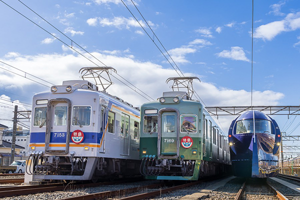 往年の四国号マークを携えた現行と復刻カラーの7100系、そしてラピートが並んだ泉佐野市のふるさと納税返礼品撮影会での一コマ。