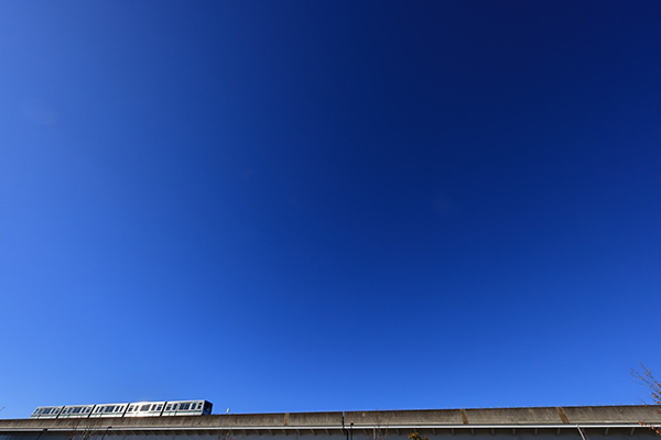 雲ひとつない冬空の下、日暮里・舎人ライナーが煌めいて駆けて行きました。