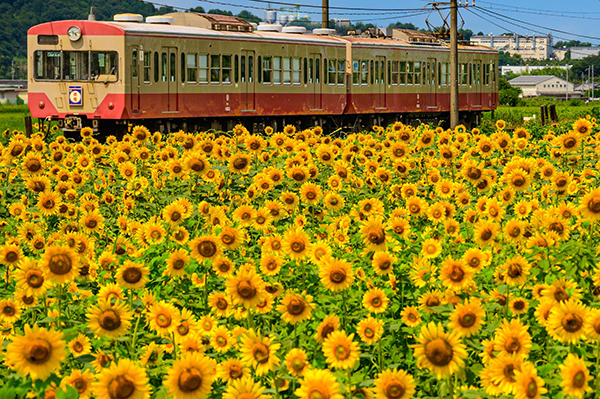 満開のひまわり畑に猛烈な暑さが戻ってきた。その中を、人気者の「赤電」が走り抜ける。