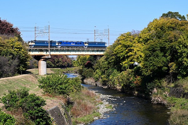 大宮で行われるイベントで展示される電気機関車たちが同僚のエスコートで柳瀬川を渡り、鉄道のまちの整備工場へ向かいました。