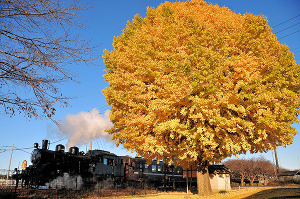 来年度、修理のため全面運休が発表されて残り少ない今シーズンを力強く走る「SLもおか号」。その姿を満開のイチョウの木が見守っていました。