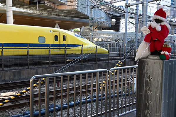 サンタクロースになった小便小僧の横を「ドクターイエロー」が走り抜けます。何かいい事ありそうな。