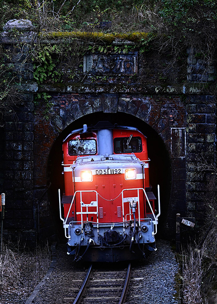 歴史を感じる煉瓦作りのトンネルから姿を現したのは赤い機関車でした