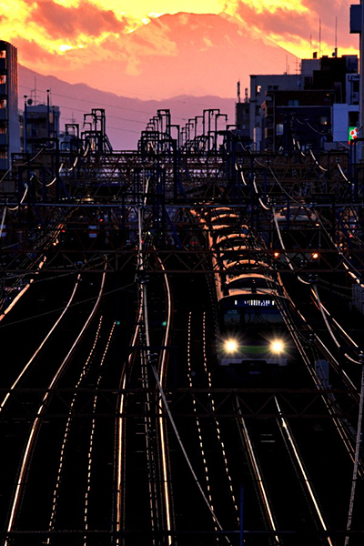 黄昏富士を背景に上り列車が二列で勾配を下ってきました。
