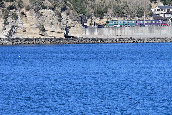 小動(こゆるぎ)岬の荒々しい崖の横を、嵐電カラーの車両を従えた1000形がゆっくり通り過ぎました。